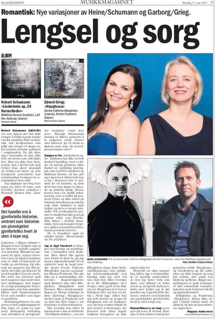«Fick kraftigt tunnelseende när konserten närmade sig slutet. Något sådant har jag aldri upplevt förut. Tårarna rann, ock jag ville stänga ute hela världen. Jag ville vara ensam med min upplevelse. Jag ville inte at nogon skulle se mig. Inte bara fick jag bearbeta några tidigare flickvänner i Are Sandbakkens og Kristin Fossheims tolkning av Schumanns Dichterliebe, men jag fick också erfara mycket nytt av kärlekens väsen i den här stora tolkningen av Heines och Schumanns verk. De två har arbetat med romantikens tolkningstradition, och deras arbete er banebrytande. Jag har letat i mitt minne i kväll efter mer interessanta tolkningar jag har hört av verk överhuvudtaget, och så långt har jag inte hittat något som kan tävla med kvällens upplevelse. Det skall bli fantastiskt att skriva för Klassekampen om konserten. Jag kommer att kreva stor spaltplats. Irriterande nog tar det två veckor innan jag får den, men jag måste bara skrika ut något om den här upplevelsen, så det kommer.»